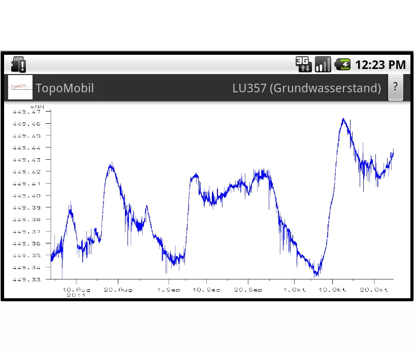 With TopoMobil you can record data in the field, and send it directly to the time series database in the office. TopoMobil is an Android app tailored for smartphones. It interfaces with the time series database via TSTP. Thus, newly acquired data is written and displayed in a graphic for control along with inventory data. You scroll through a list of measuring stations or search within it. The parameters to be recorded are configured per measuring station (done via TopoDesk). You now enter the values and, if necessary, information about them. In addition, you can retrieve job site tasks that you or your colleagues have prepared in the office (such as cutting grass). You can also capture notes (e.g., dam removed).